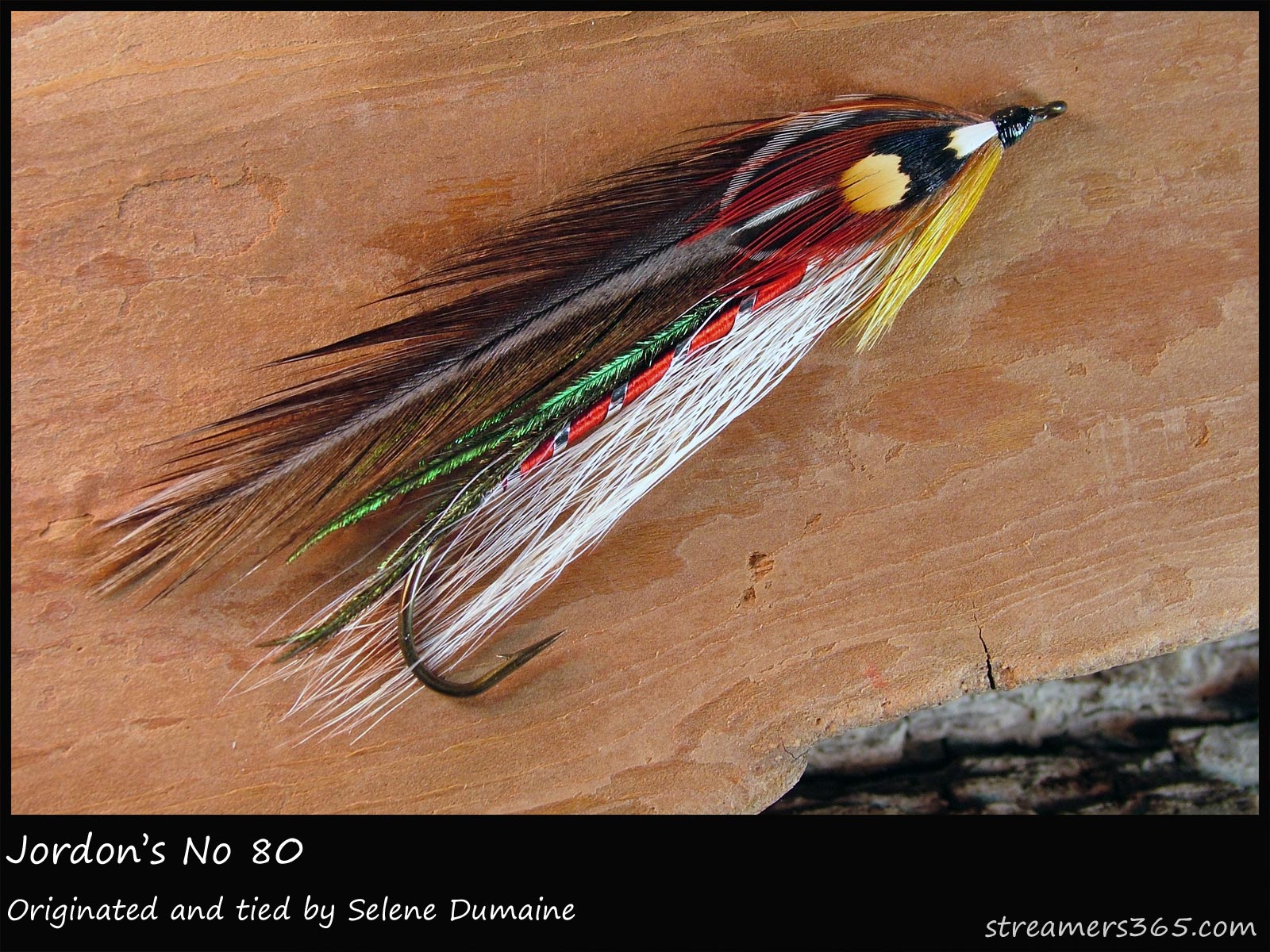 Notes: Selene created Jordan's No. 80 to commemorate Richard A Jordan's eightieth birthday in April 2007. Selene was inspired to tie during a pleasant visit with his grandson, Dan Hillier. Dan, and avid angler himself, had great suggestions for the fly, and the collaboration proved a success. The pattern has a classic look with its white belly and red body while the natural dun hackle is reminiscent of the early days of the long flies. The throat of yellow golden pheasant is a beautiful feature, something I'm considering adding to my own next creation. The muted yellow rounds out the antique look of the streamer.