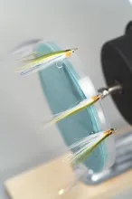 Prepare a whole bunch of flies. The disc on my rotor easily handles 15-20 flies. Now coat them with epoxy in your rotary vice and transfer them to the rotor. It runs so slowly that you can easily stick the fly in a vacant spot without turning off the motor.