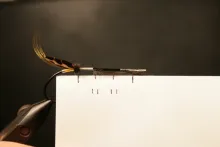 Step 21: place them back by back on top of the hook shank. Make a tread loop and tie down the fibres while you hold them with your left hand to make sure they stay on the top.