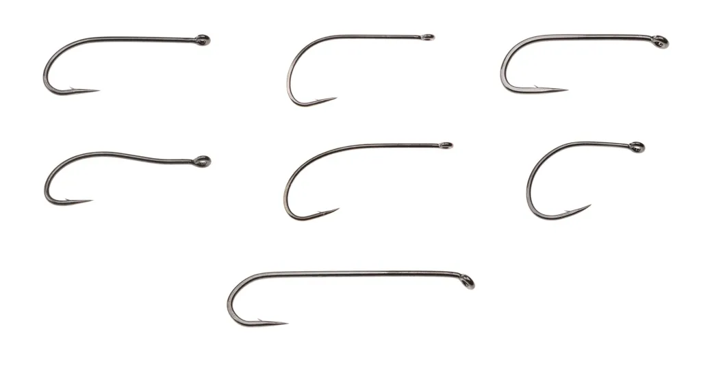 From top left: NS110 straight eye streamer, NS122 light stinger, NS155 heavy wire streamer, NS150 curved shrimp, NS156 shrimp, NS172 gammarus/grub, NS118 long shank down eye streamer