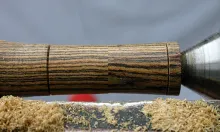 Sand to at least 800 grit and use the parting tool to detach both barrels at the sizing grooves, starting with the top barrel. Finish the barrel opening by hand using the side scraper, the inner wall of the barrel using sand paper and the bottom of the hole in the lower barrel using epoxy (a thin layer of epoxy will ensure a completely smooth bottom). Treat the whole stacker (inside and out) with boiled linseed oil.